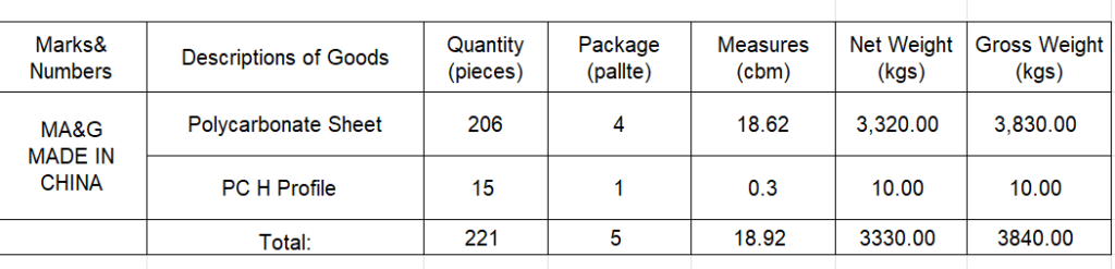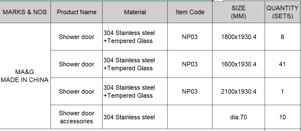 Delivery of PC panels+H profile, shower door and anchor bolts.
